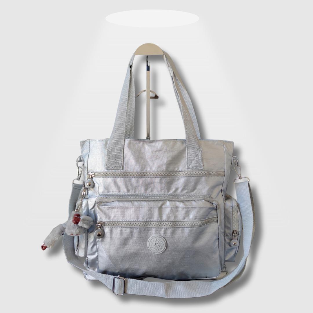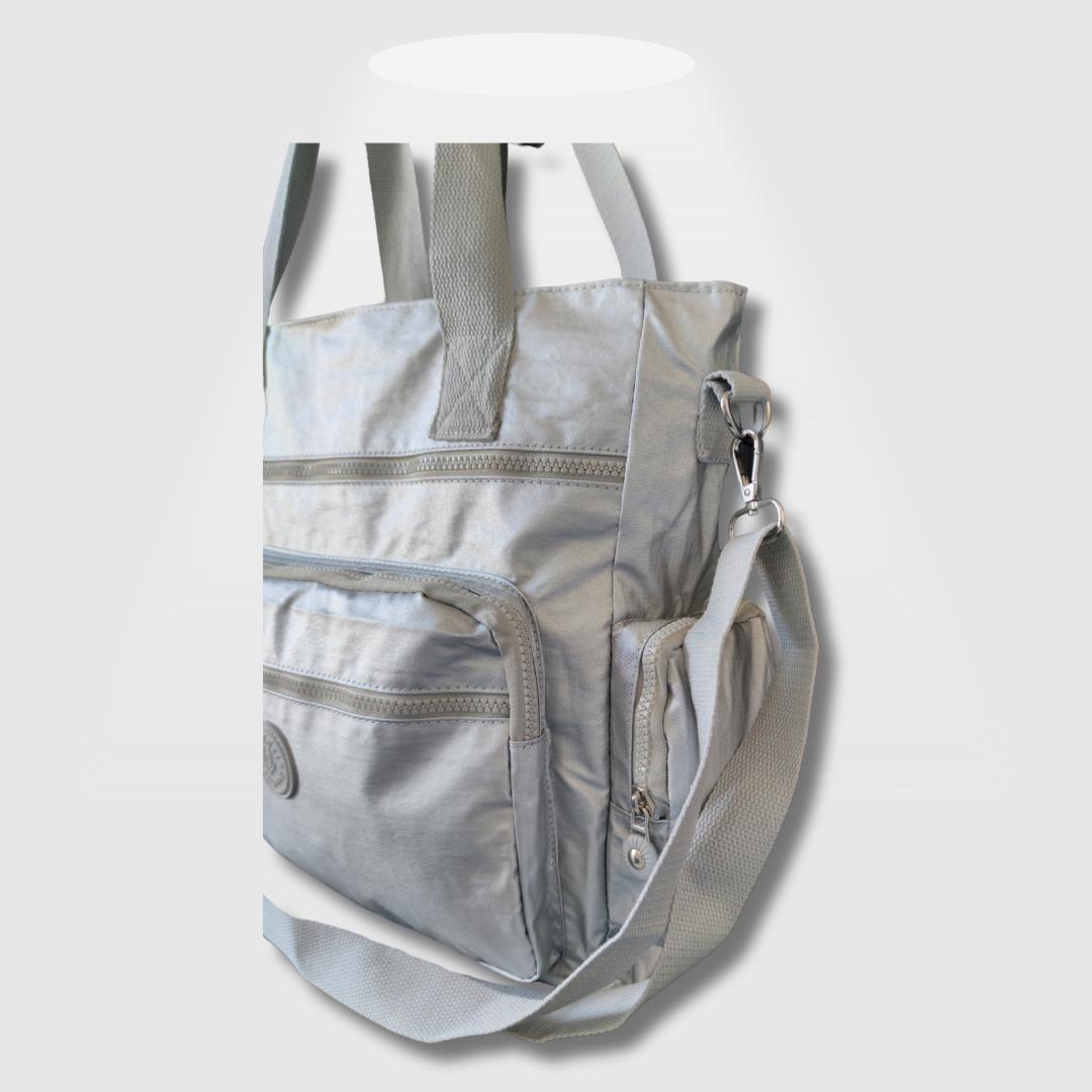 Bolso de 8 compartimientos ideal para llevar tus cosas esenciales gracias a sus múltiples compartimientos y diseño con un estilo en tela impermeable metalizada.
