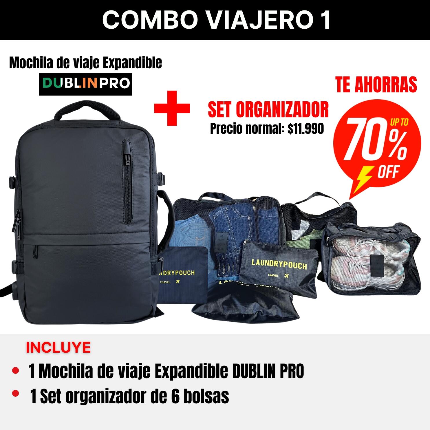 Viajar nunca fue tan cómodo. Con el Combo Viajero llevas tu mochila de cabina que cumple las medidas exactas exigidas por las aerolíneas ✈️ y además un set organizador de 6 bolsas que mantiene tu ropa y accesorios en orden. Olvídate del estrés y de pagar extras: viaja ligero, práctico y con todo bajo control. Una solución pensada para quienes disfrutan cada trayecto con estilo y comodidad.