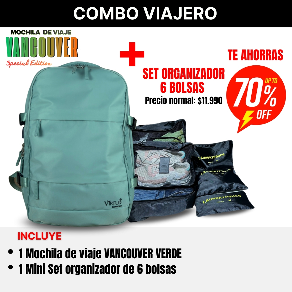 Viajar nunca fue tan cómodo. Con el Combo Viajero llevas tu mochila de cabina que cumple las medidas exactas exigidas por las aerolíneas ✈️ y además un set organizador de 6 bolsas que mantiene tu ropa y accesorios en orden. Olvídate del estrés y de pagar extras: viaja ligero, práctico y con todo bajo control. Una solución pensada para quienes disfrutan cada trayecto con estilo y comodidad.