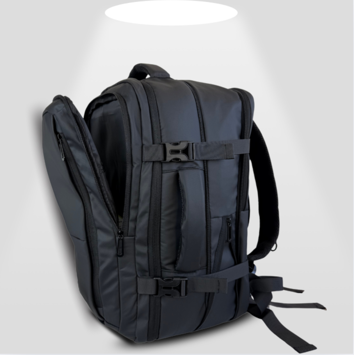 Mochila de viaje expandible Dublin Pro, de 5 compartimientos uno de ellos especial para llevar la notebook y esta diseñada en tela impermeable firme y resistente.