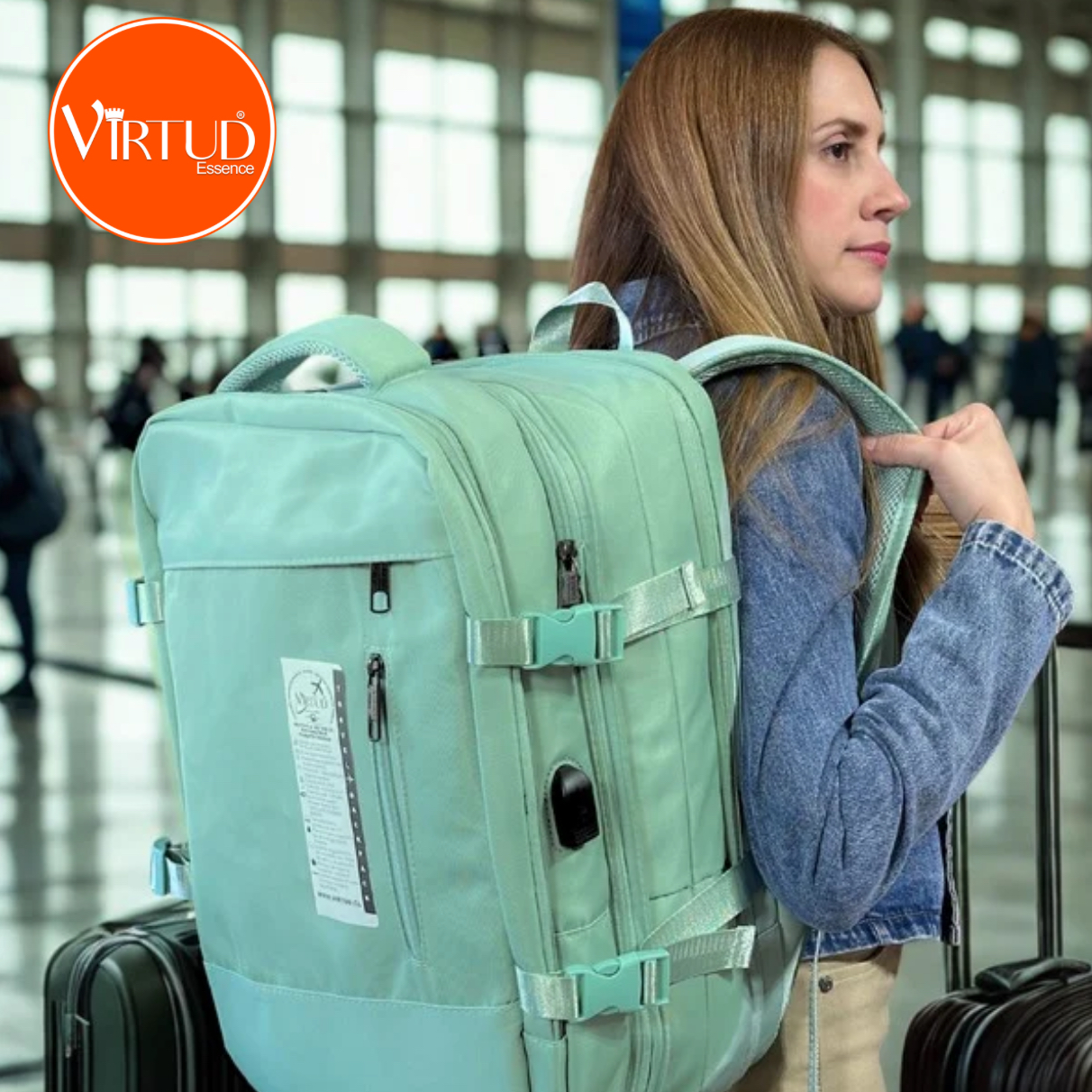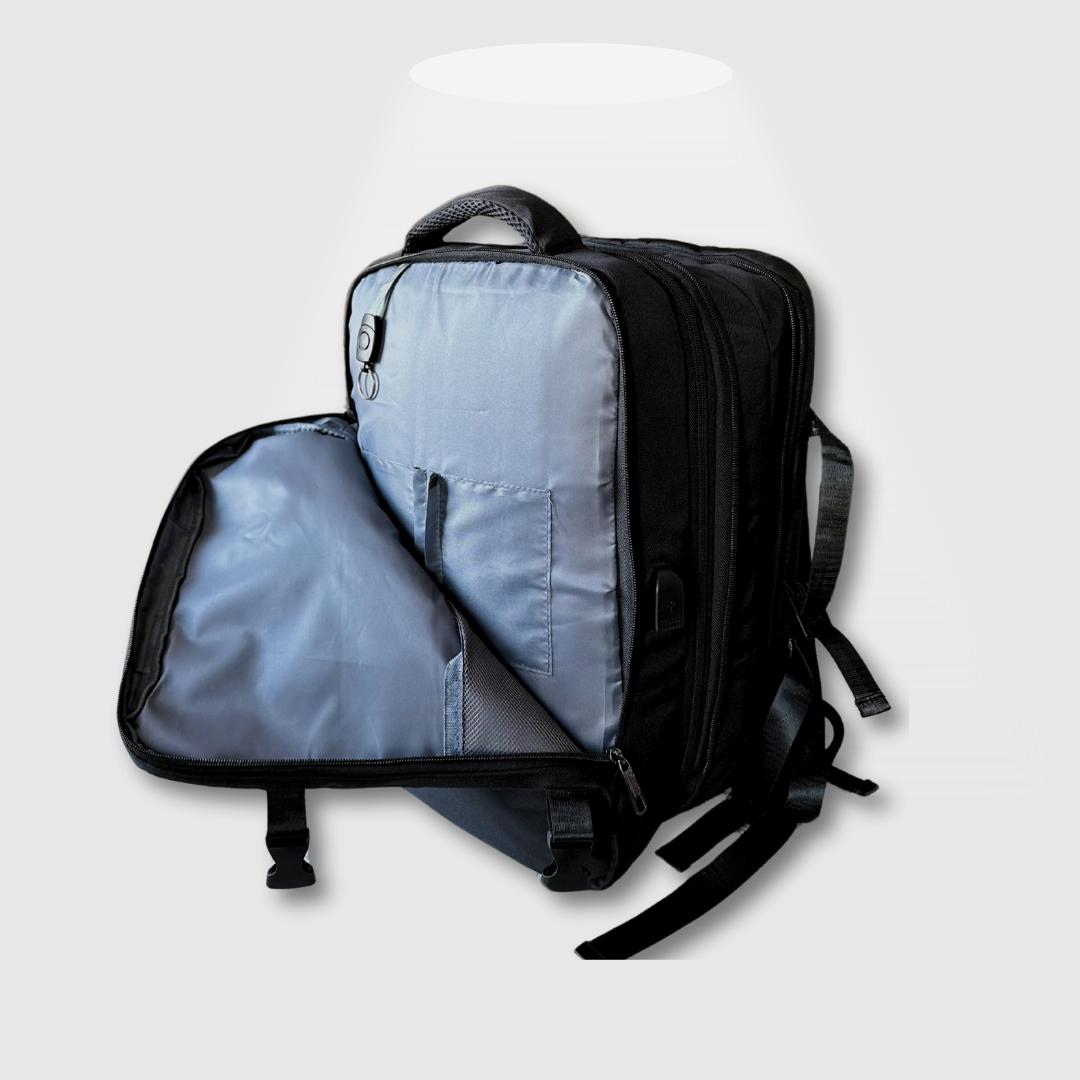 Mochila de viaje expandible Puerto Varas, cuenta con 6 compartimientos, uno de ellos especial para llevar la notebook y uno para tablet, esta diseñada en tela de poliester de alta calidad firme y resistente. Ideal para llevar en el compartimiento superior o debajo del asiento del avión como bolso de mano o articulo personal sin tener que facturarla como equipaje extra ya que cuenta con las medidas que exigen las aerolíneas.