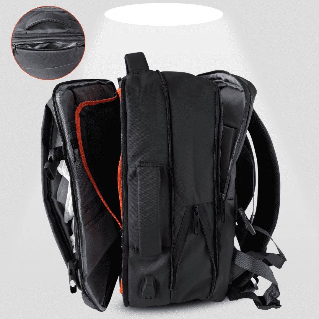 Su capacidad ajustable de 25 a 40L te permite adaptarla a cada aerolínea, ya sea en modo compacto o expandido. Con múltiples compartimientos internos y externos, un puerto USB-C integrado y un diseño ergonómico acolchado, tendrás organización, seguridad y confort en todo momento.