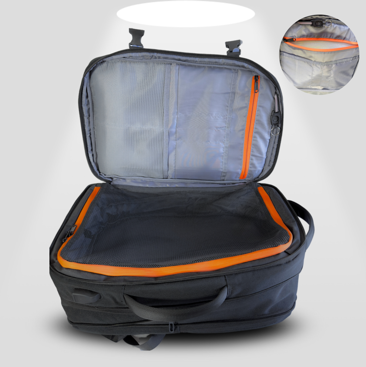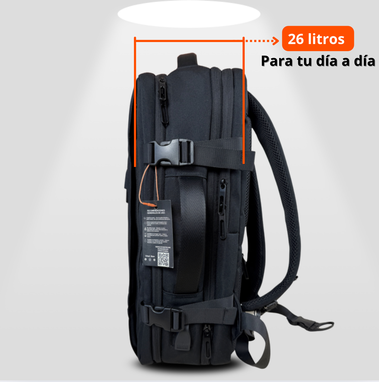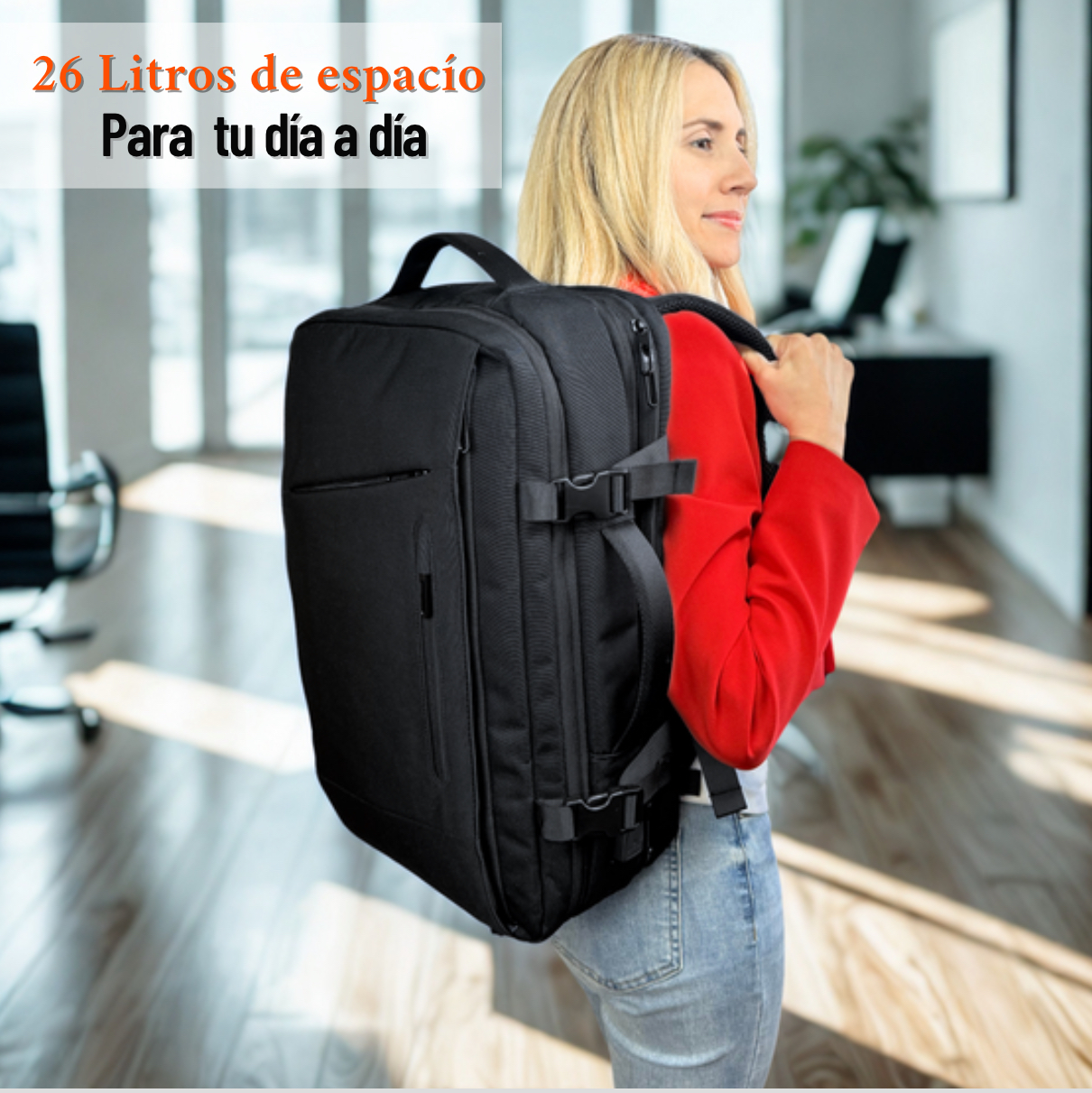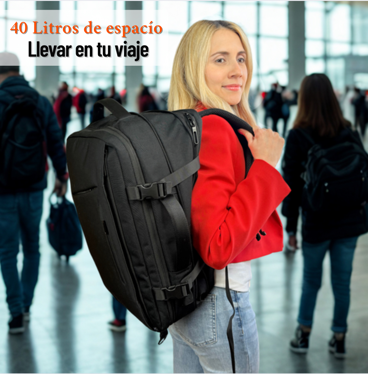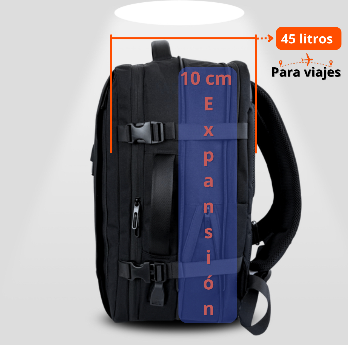 Viaja ligero y sin pagar maletas extras con la Mochila de Viaje Expandible Premium Pro. Diseñada para cumplir con las medidas de las aerolíneas y llevar en el compartimiento superior o debajo del asiento del avión como bolso de mano o articulo personal sin tener que facturarla. ofrece 40L de capacidad, tela impermeable, compartimentos inteligentes y puerto USB-C. Ideal para viajes cortos, ejecutivos, de turismo y familias organizadas.